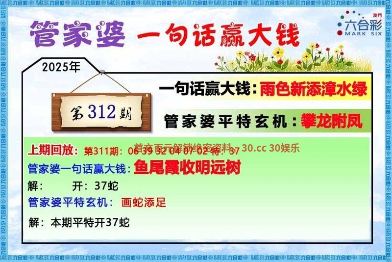 | 312期:一句话赢大钱【雨色新添漳水绿】 解析:雨色新添漳水绿解绿波和雨肖的生肖蛇、马、羊。 综合:虎兔马牛鼠龙 特码:04.16.15.27.24.48.29.41.18.30.02.14 |